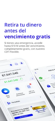 Con nuestra aplicación, puedes simular diferentes escenarios financieros, ajustando plazos y montos de inversión de acuerdo a tus necesidades y metas personales. Nuestra interfaz intuitiva te guiará a través del proceso de apertura de tu CDT de manera rápida y segura, sin la necesidad de visitar una sucursal bancaria.