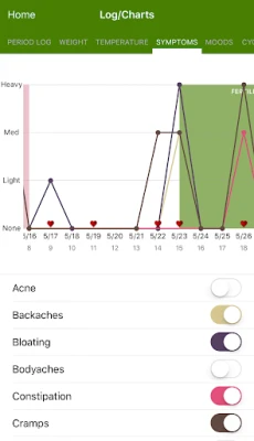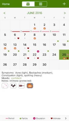 * View your current and future period dates, ovulation and fertile days, your moods and your symptoms in a simple month-view calendar.